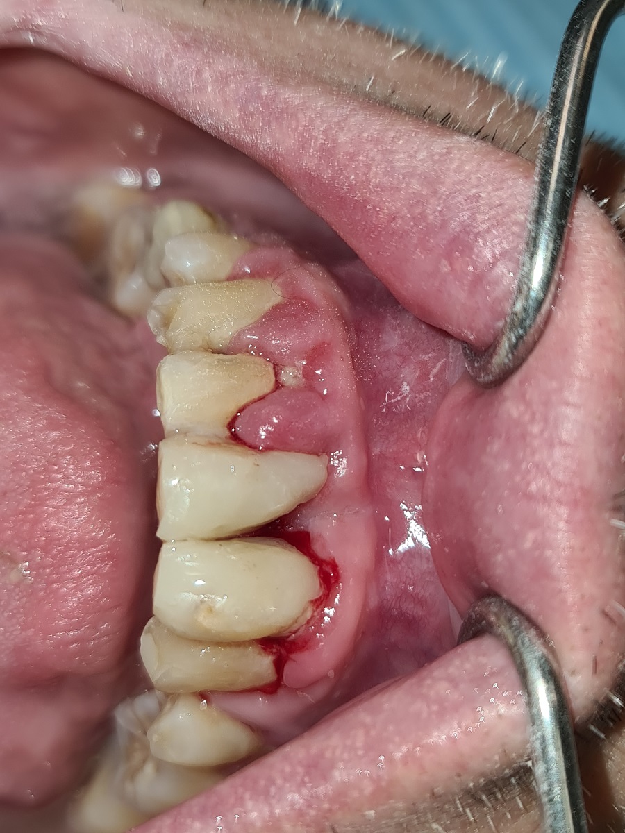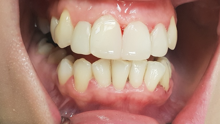 Η εκτεταμένη υφίζηση των ούλων αντιμετωπίστηκε με πλαστική του περιοδοντίου και μόσχευμα συνδετικού ιστού από την υπερώα